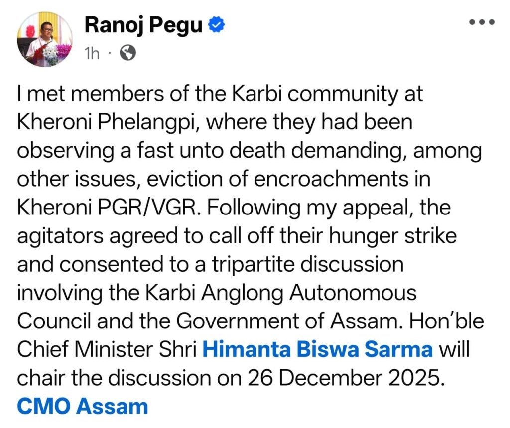 असम में कार्बी समुदाय के प्रतिनिधियों ने 6 दिसंबर से भूख हड़ताल शुरू की थी। उनका मुख्य उद्देश्य अपने क्षेत्र की जमीन पर अतिक्रमण हटाना और स्थानीय अधिकारों की सुरक्षा सुनिश्चित करना था। हालाँकि, अब असम सरकार के आश्वासन के बाद उन्होंने अपनी भूख हड़ताल समाप्त कर दी है।