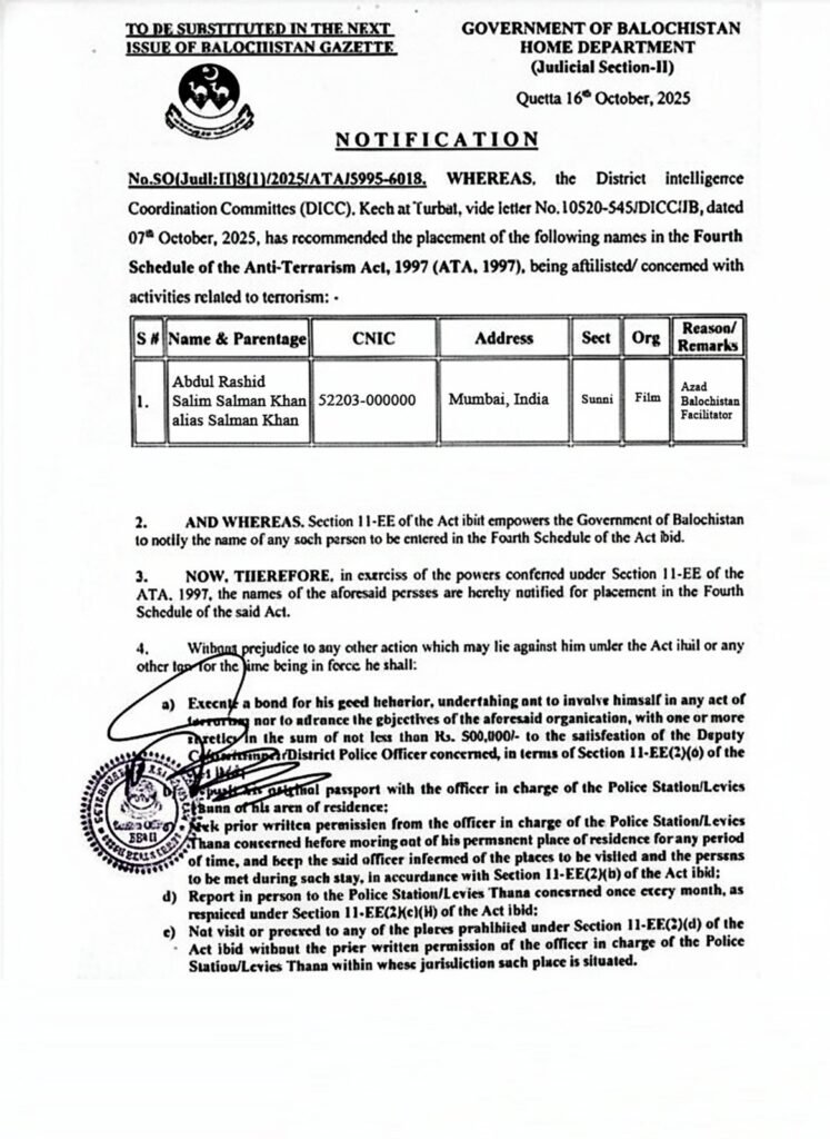 पाकिस्तान की शहबाज सरकार ने इस बयान को गंभीरता से लिया और सलमान खान को फोर्थ शेड्यूल में डालकर आतंकवादी घोषित कर दिया। गृह मंत्रालय ने इस संबंध में अधिकारिक नोटिफिकेशन भी जारी किया है। यह लिस्ट एंटी-टेररिज्म एक्ट के तहत बनती है, और इसमें शामिल किसी भी व्यक्ति पर पाकिस्तान में कानूनी कार्रवाई की जा सकती है।