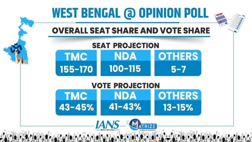 इसी बीच चुनाव से पहले एक ओपिनियन पोल भी सामने आया है, जिसने सियासी माहौल को और दिलचस्प बना दिया है। MATRIZE-IANS के इस ओपिनियन पोल में यह जानने की कोशिश की गई है कि इस समय पश्चिम बंगाल की जनता का मूड किस पार्टी के पक्ष में नजर आ रहा है। सर्वे के मुताबिक राज्य की मुख्यमंत्री ममता बनर्जी की पार्टी तृणमूल कांग्रेस एक बार फिर मजबूत स्थिति में दिखाई दे रही है। पोल के अनुसार तृणमूल कांग्रेस को करीब एक सौ पचपन से एक सौ सत्तर सीटें मिल सकती हैं। अगर ऐसा होता है तो ममता बनर्जी लगातार चौथी बार राज्य की सत्ता में वापसी कर सकती हैं।