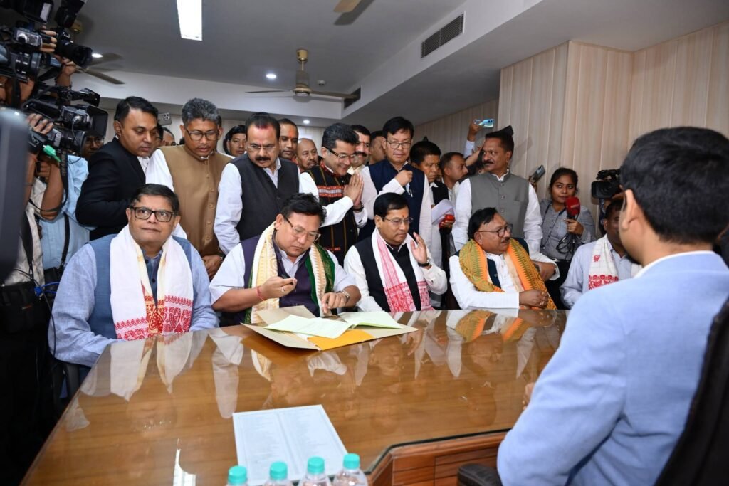The nomination filing took place in the presence of Union Minister Sarbananda Sonowal, who attended the process as a senior leader of the ruling alliance.